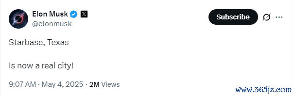 太空探索技术公司首席执行官埃隆·马斯克在社交媒体发文:“得克萨斯的星舰基地,现在是一座真正的城市了!”。